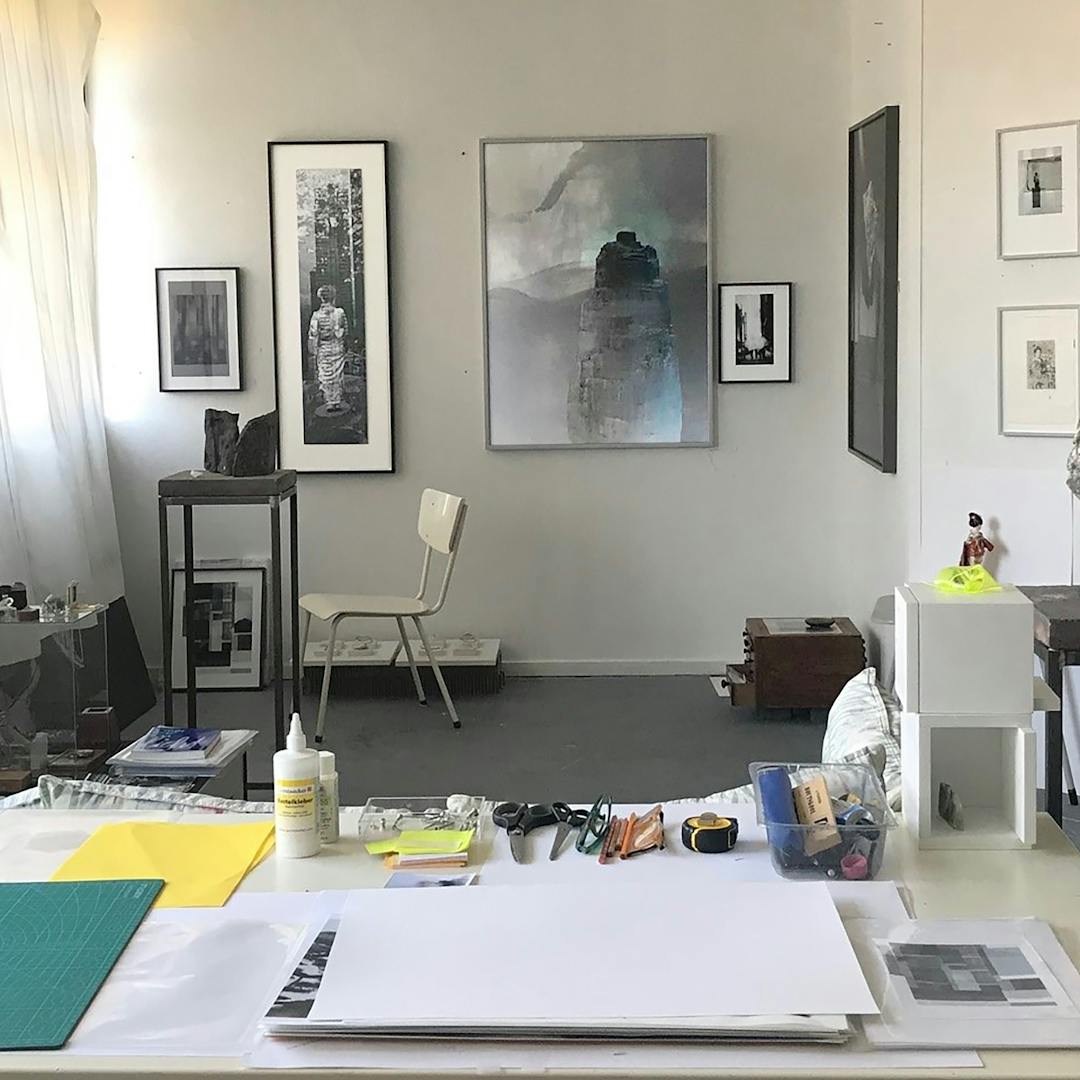 Mijn werkplek - licht en ruim. Ik voel me vrij, dicht bij mezelf. Alles mag en kan, nu en toen vallen samen, iets uit het niets maken, een spel van loslaten, twijfelen, volhouden en weer anders. Veel ideeën, kiezen. Meer creaties tegelijk, de afwisseling, dan weer focus, Foto’s als herinnering, ik schilder en teken mijn gevoel erover heen. Mijn printer tovert met pigmenten op het mat papier, ik kan ze aanraken. 3d-verbeelding is nooit ver weg, ook de stenen van mijn vader vinden hun weg in mijn werk. Ik maak mijn eigen mis-en-scene en leg het vast, speel met het licht dat door de ramen valt. De wereld die ik op mijn reizen waarneem landt hier en wordt zo een nieuwe werkelijkheid. Zo levendig als het proces is, zo sereen is mijn uiteindelijk werk. Ik deel mijn wereld graag met anderen, de deur van mijn studio staat altijd open voor bezoek.